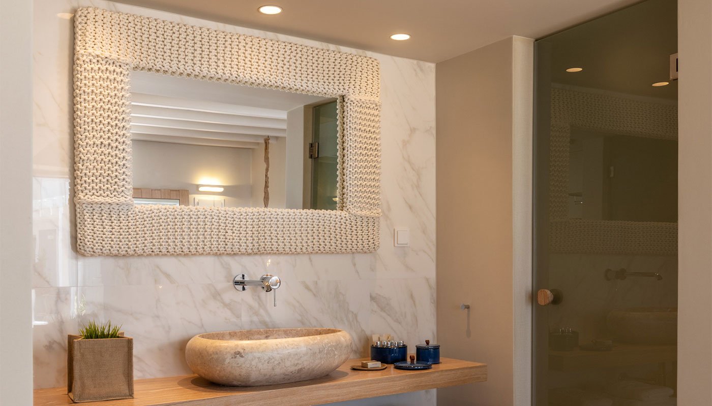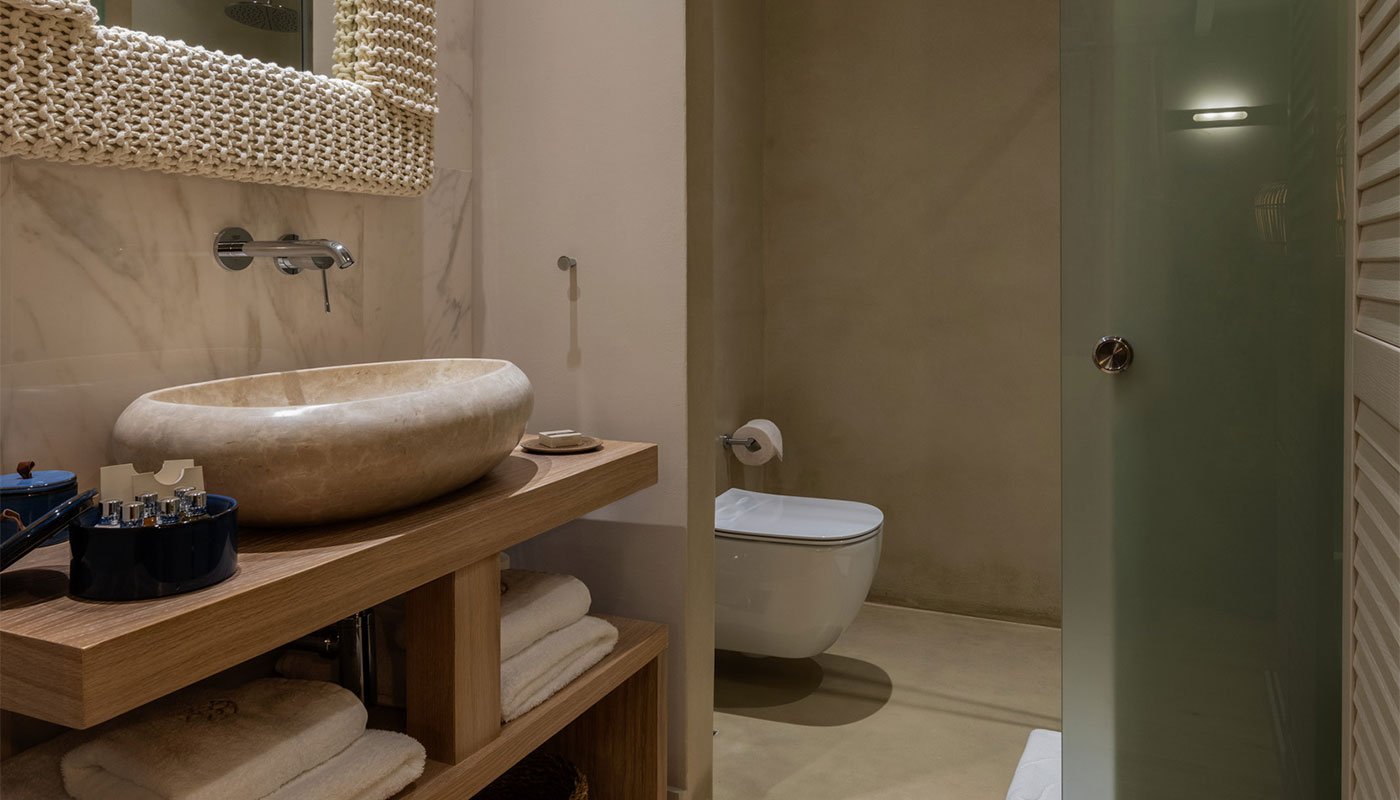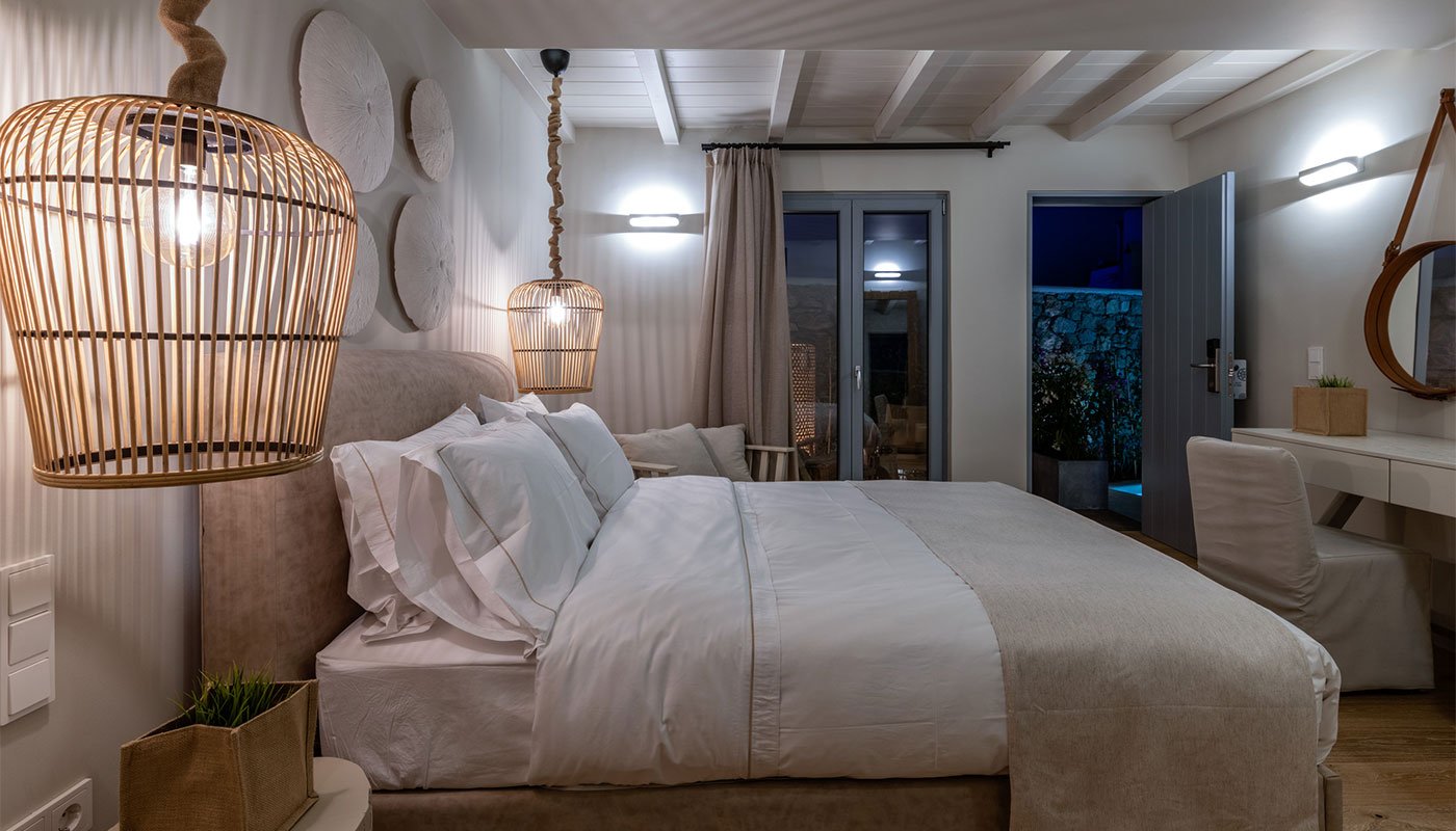 Subtle accents pay homage to Mykonos’ unique landscape, such as domed latticed lampshades, tree stump bedside tables, and white-washed wardrobes. An extensive, marble-appointed bathroom vanity space faces the suite, offsetting its softness with a little grandeur, and the walk-in shower is spacious and stocked with exclusive Molton Brown amenities.
